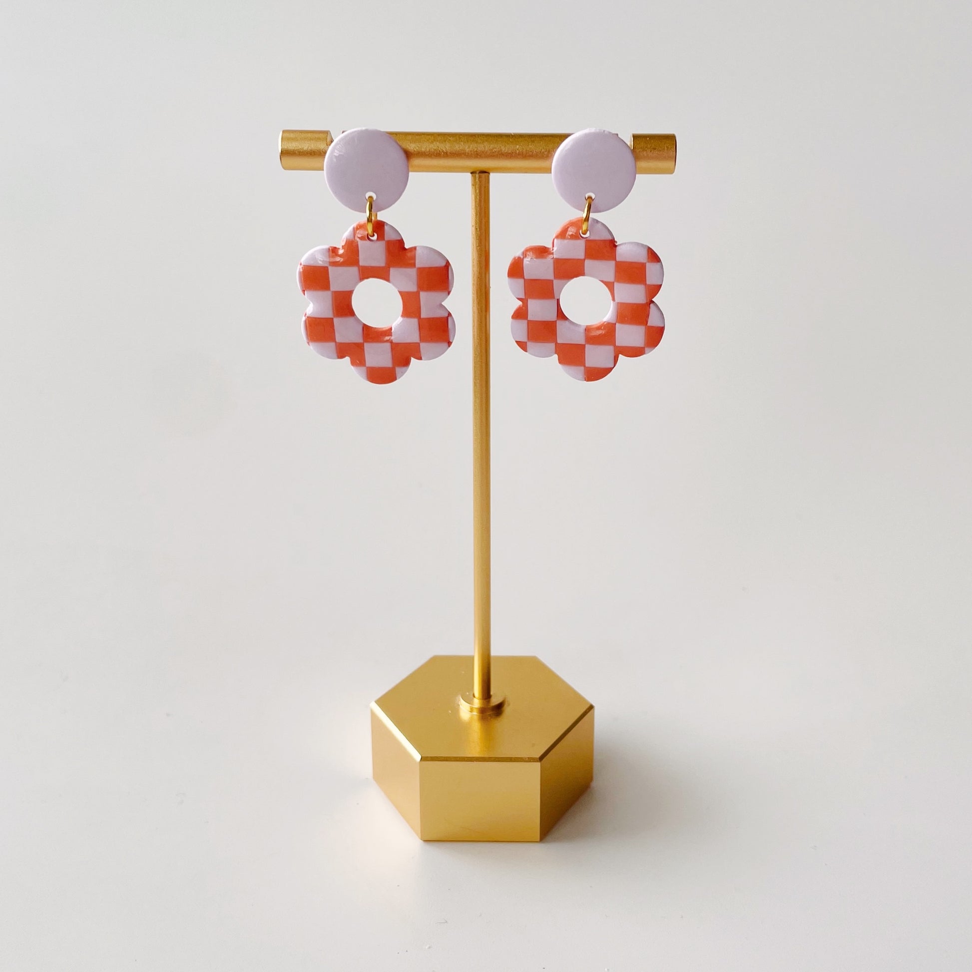 Our fan favorite checkerboard daisy earrings are back again in a new colorful variation. Featuring a handmade checkerboard pattern and a layer of resin to add shine.