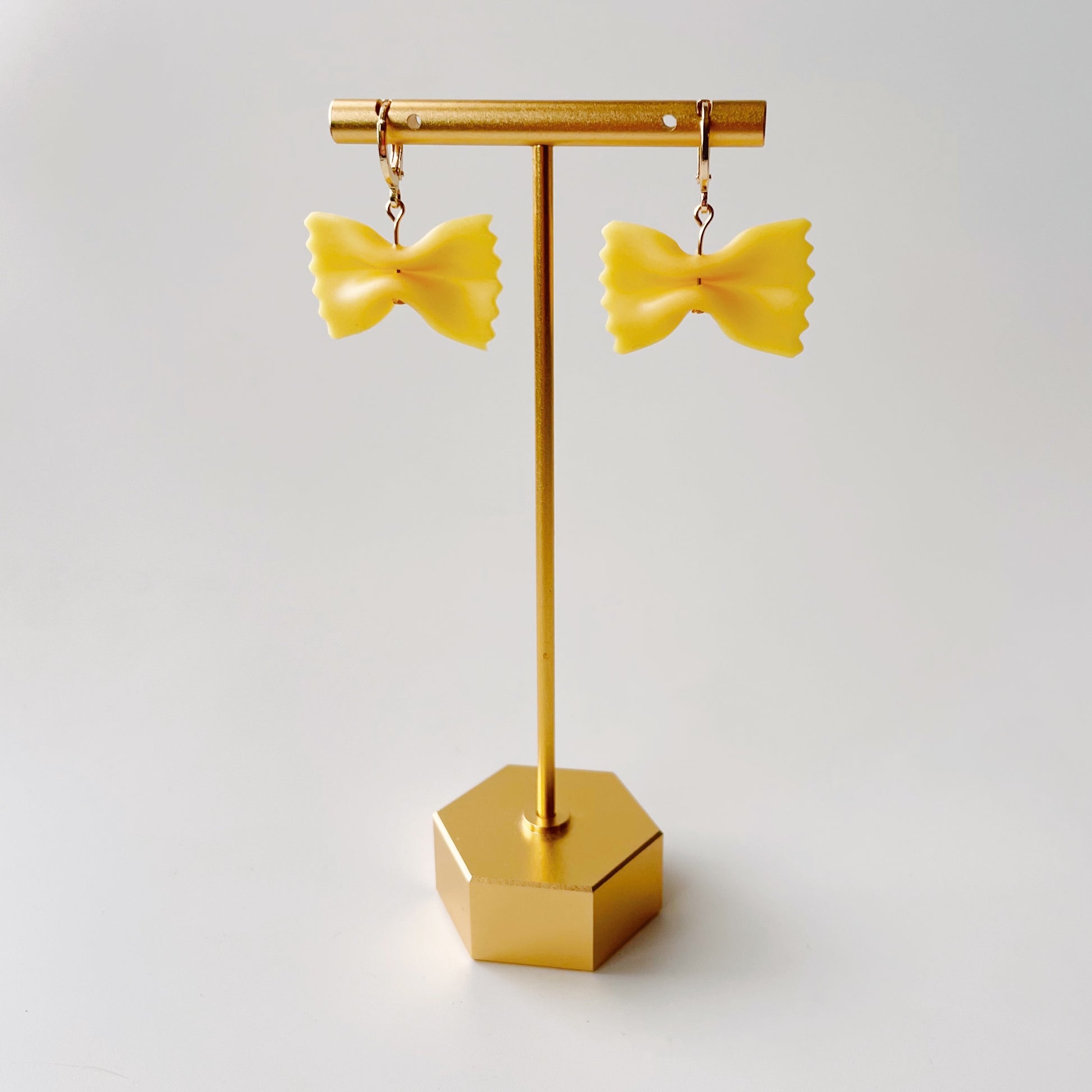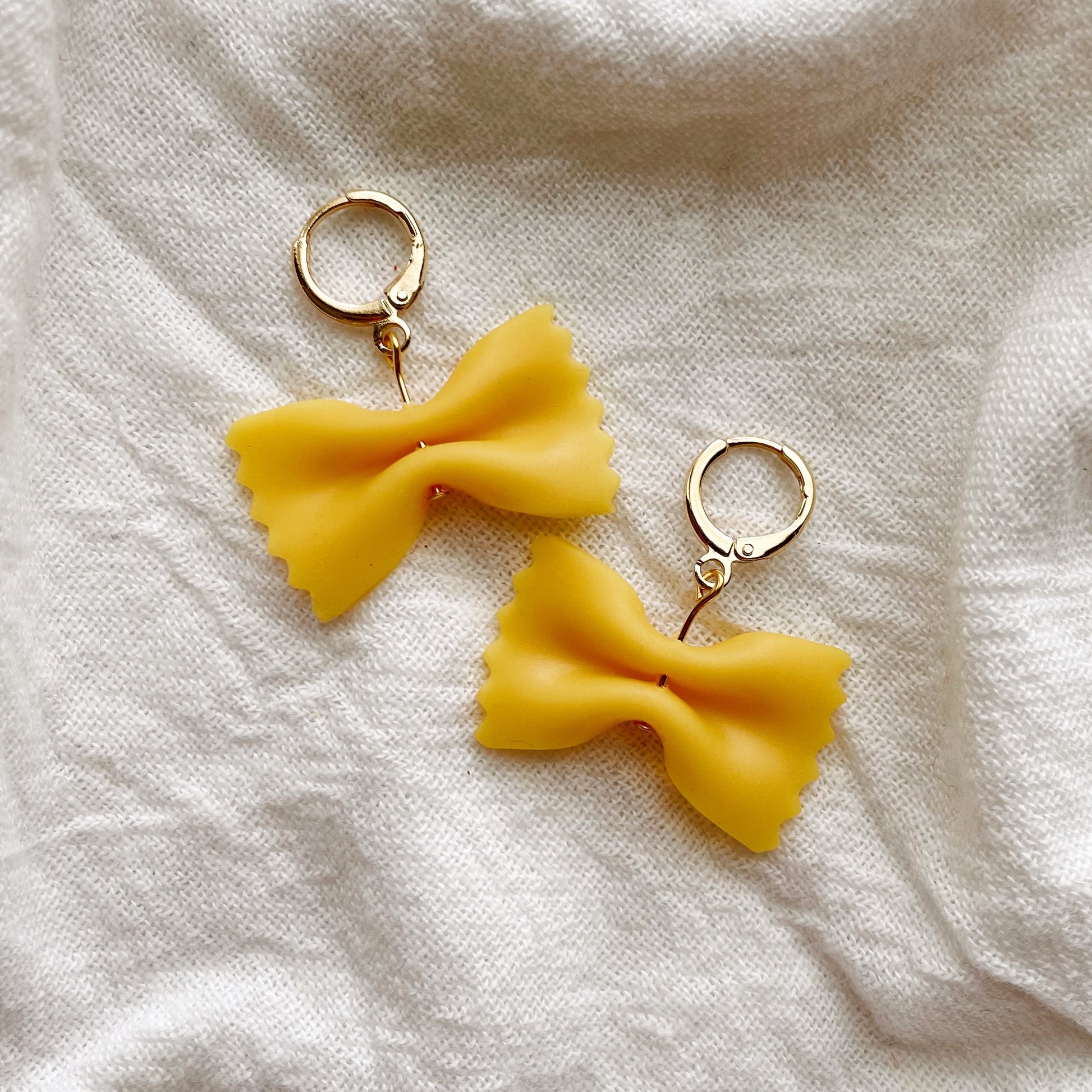 Show your love for the most important food group with these adorable pasta-shaped earrings! Every earring is hand shaped out of polymer clay and attached to gold-plated leverback huggie hoops.