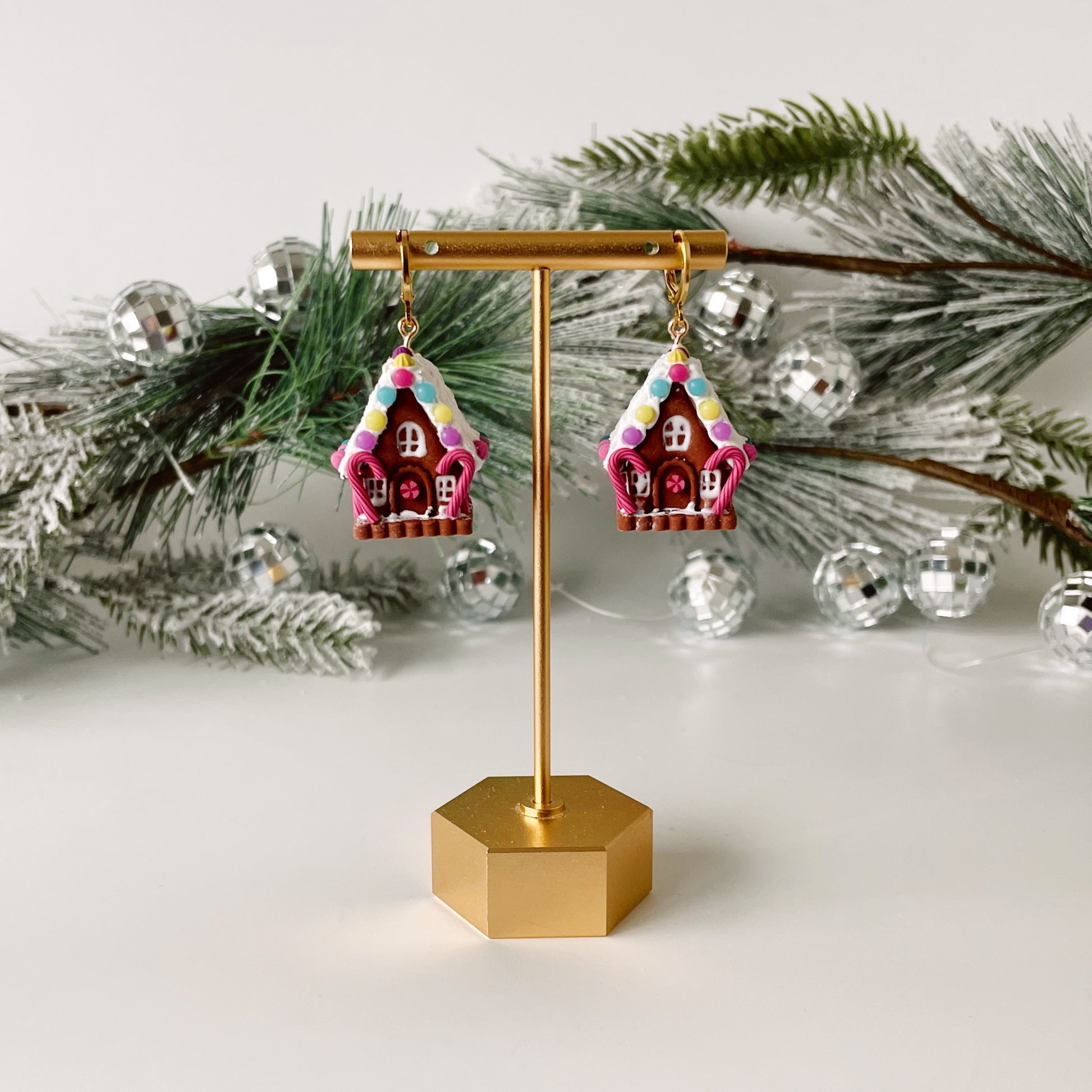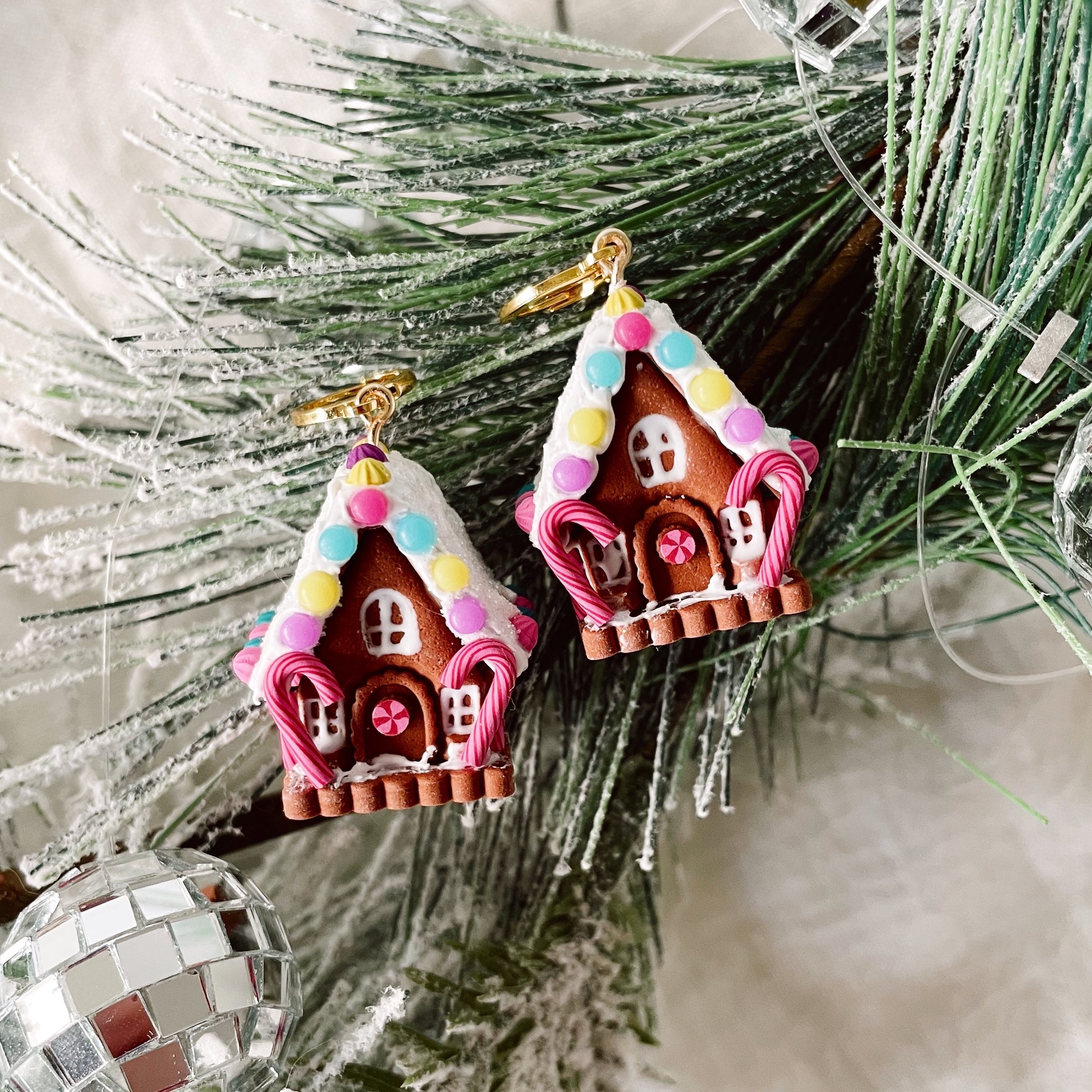 They're back, and this year they're even brighter and more intricate than before! These miniature gingerbread house dangles are hand-built from start to finish, from the imitation icing to the tiny handmade candy detailing. Every pair is truly unique. A work of art to wear all holiday season.