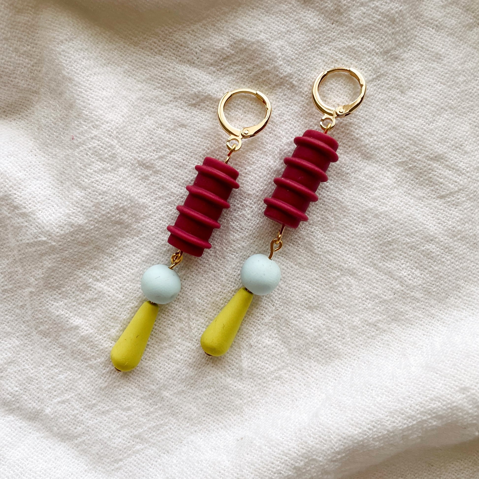 Make a statement with Matilda! This pair features a selection of funky, bright handmade polymer clay beads, all attached to a gold-plated leverback hoop fixture.