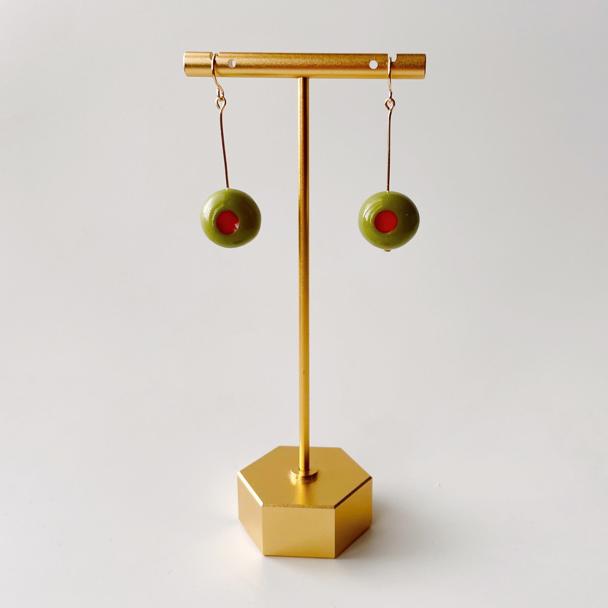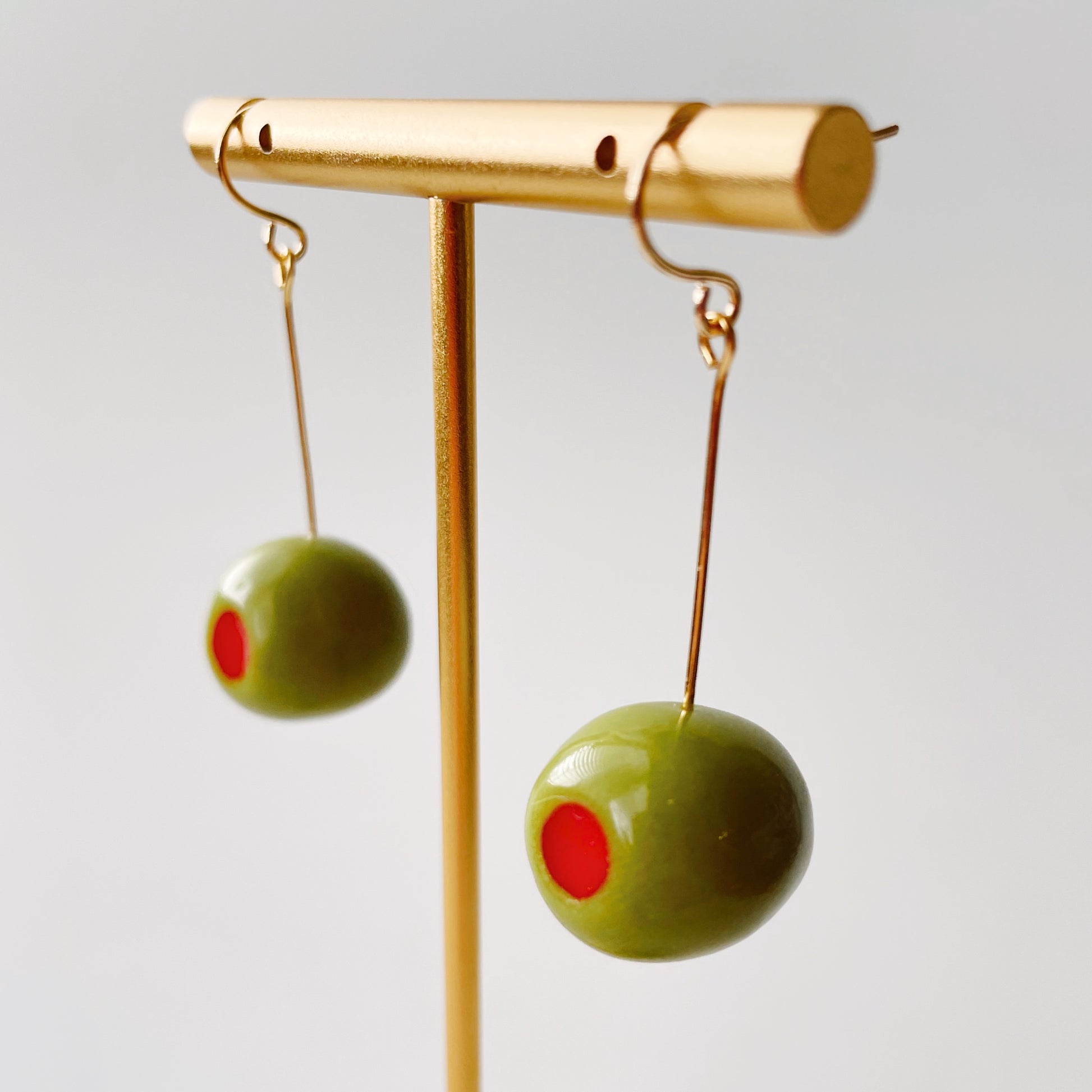 The perfect garnish for your martini AND your ears! These green olive dangles are absolute stunners. Each individual olive bead is hand shaped before being cured, coated in a shiny layer of resin, and assembled with gold-plated ear wires.