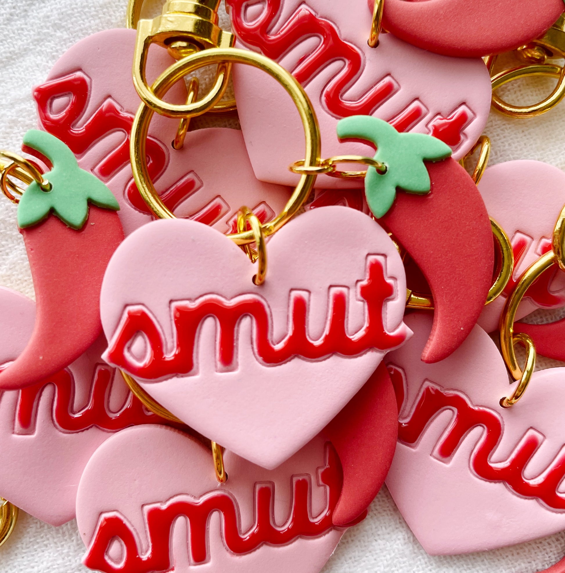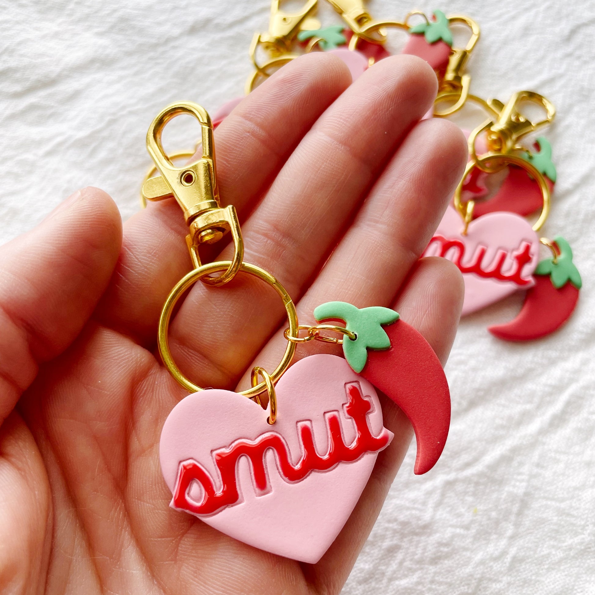 Keychains feature handmade polymer clay pendants attached to gold metal lobster clasp keychain hardware.